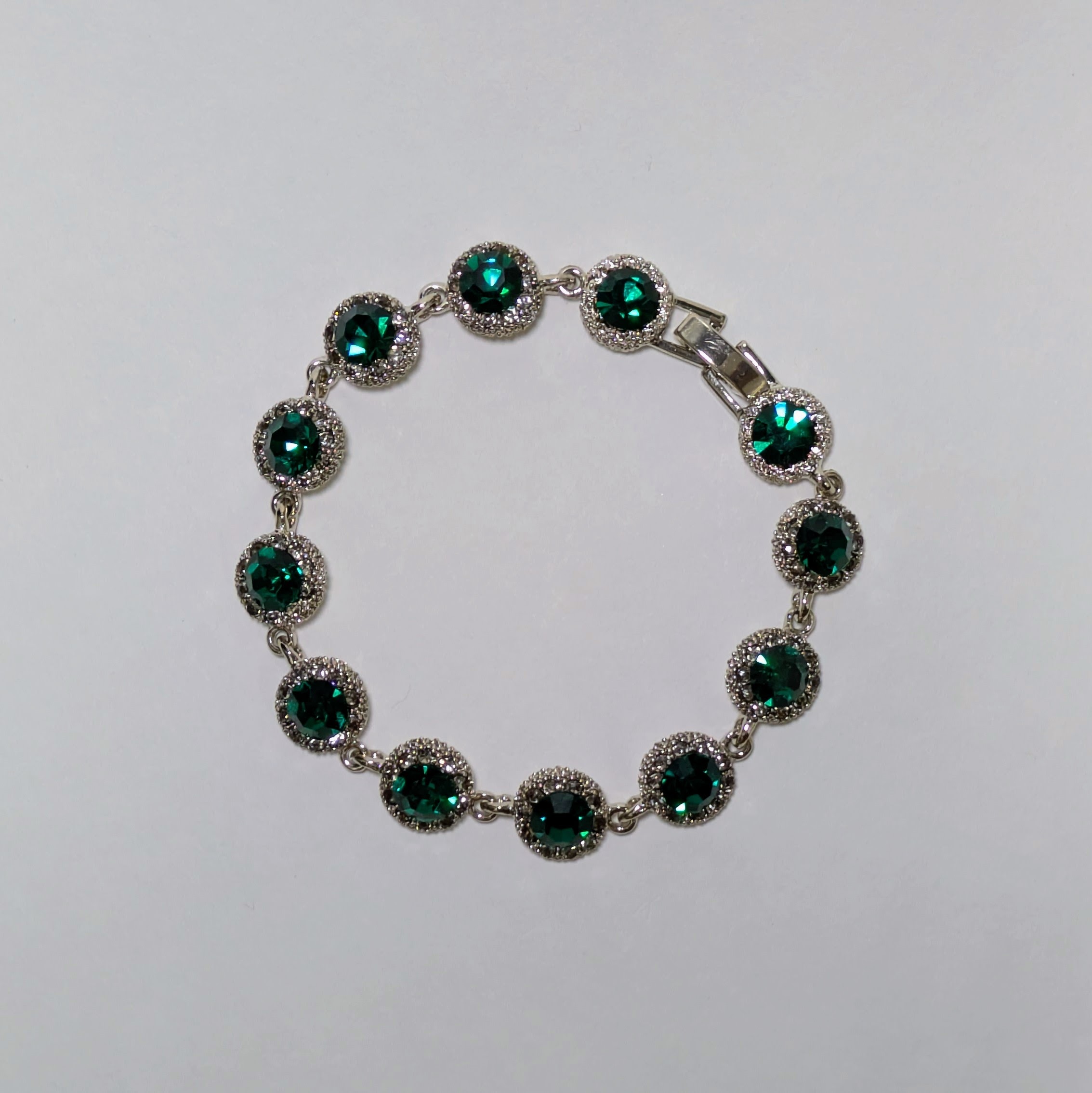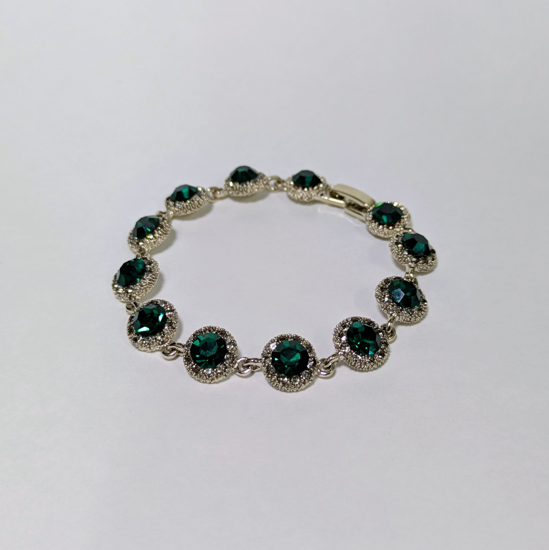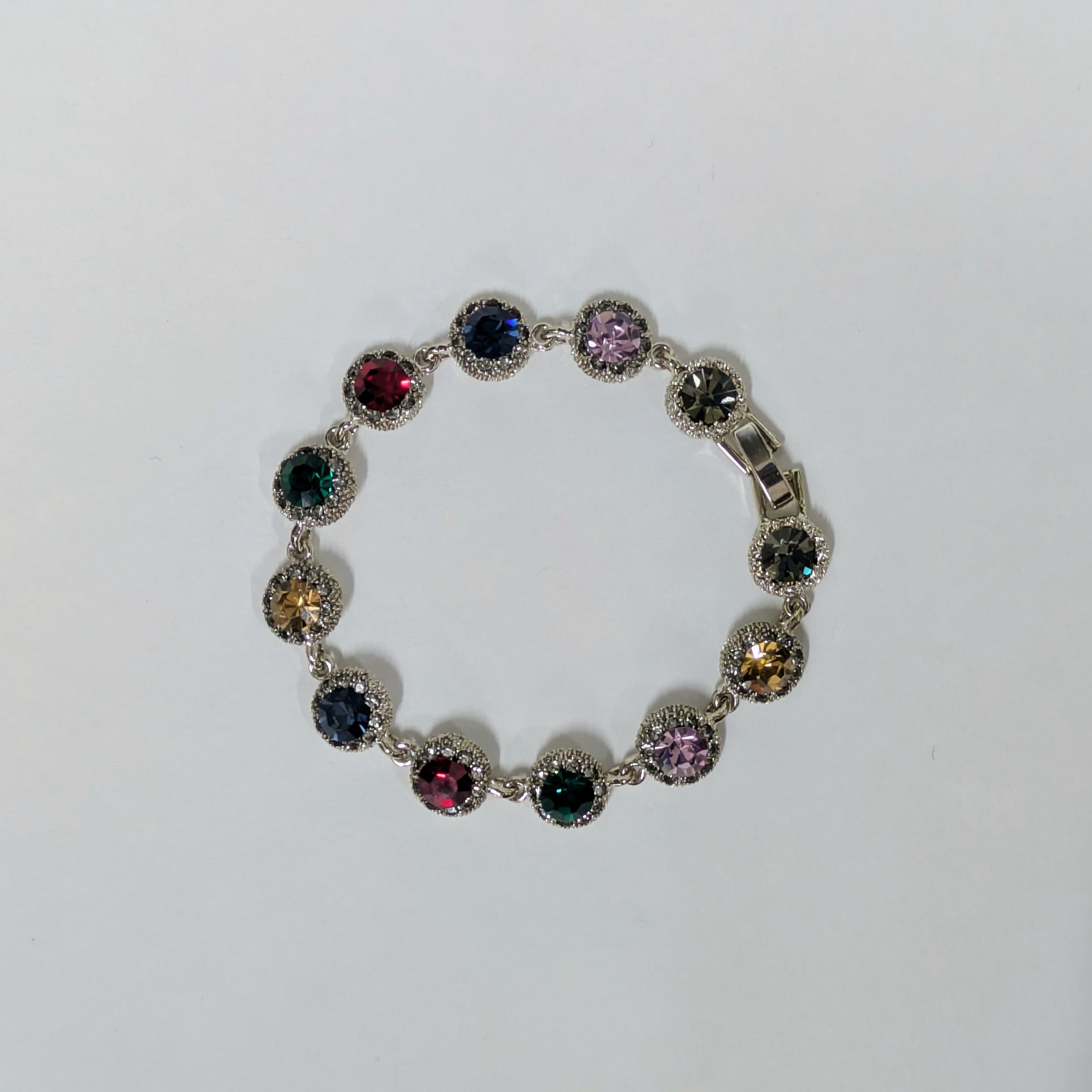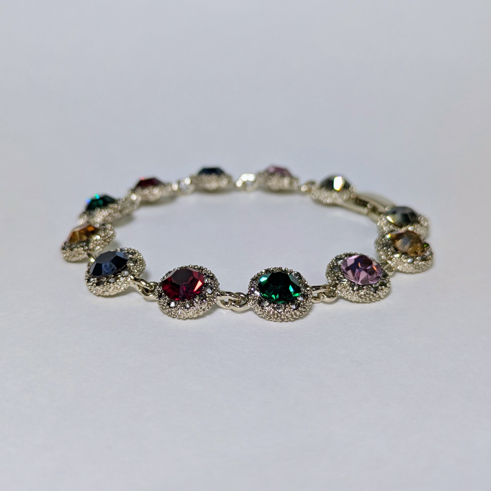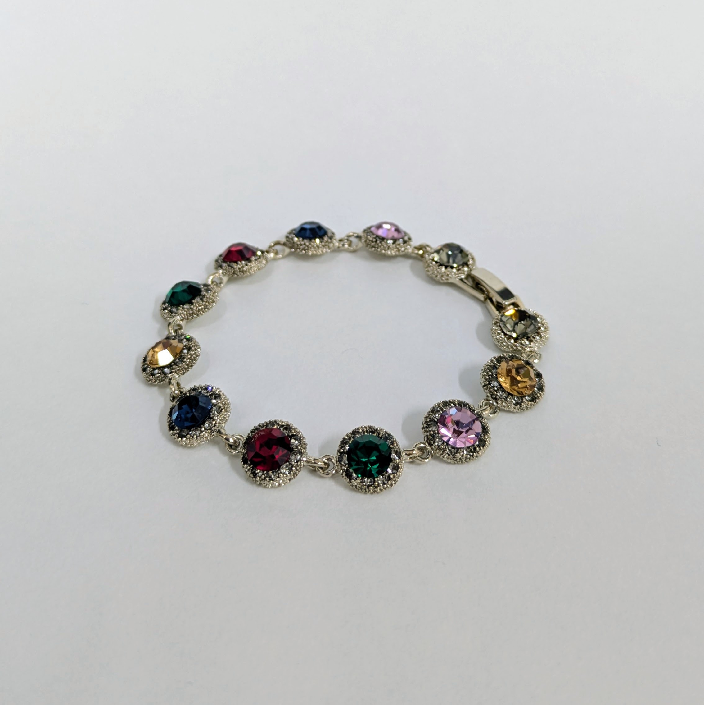 The Gemma Collection Bracelets feature dazzling round-cut crystals in vibrant shades like green, red, pink, navy, grey, and multicolour, all encased in a sparkling silver-tone frame. Elegant yet versatile, these imitation jewellery bracelets add a touch of glamour to both ethnic and western outfits, making them perfect for festive occasions, parties, or everyday sophistication.
