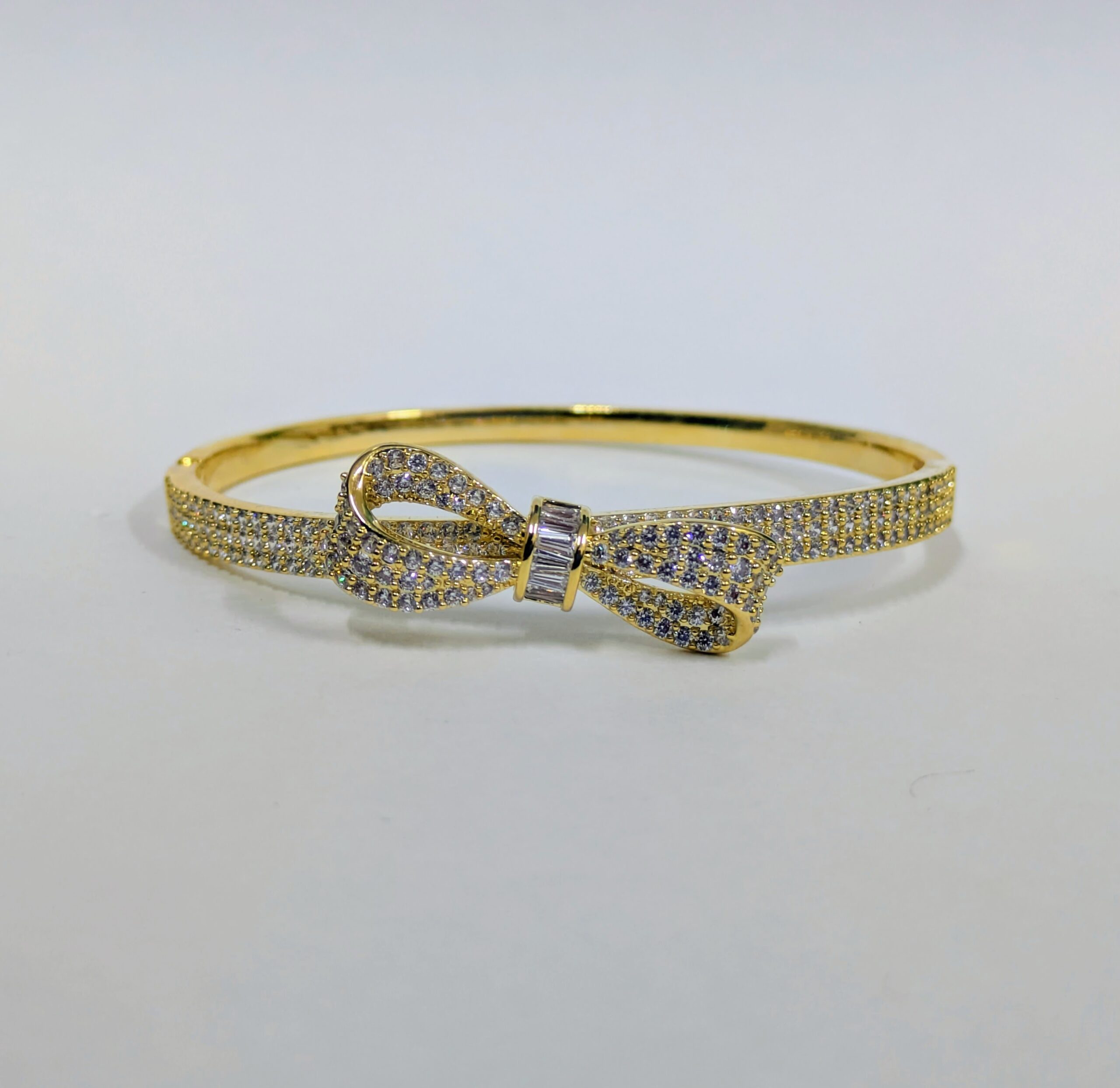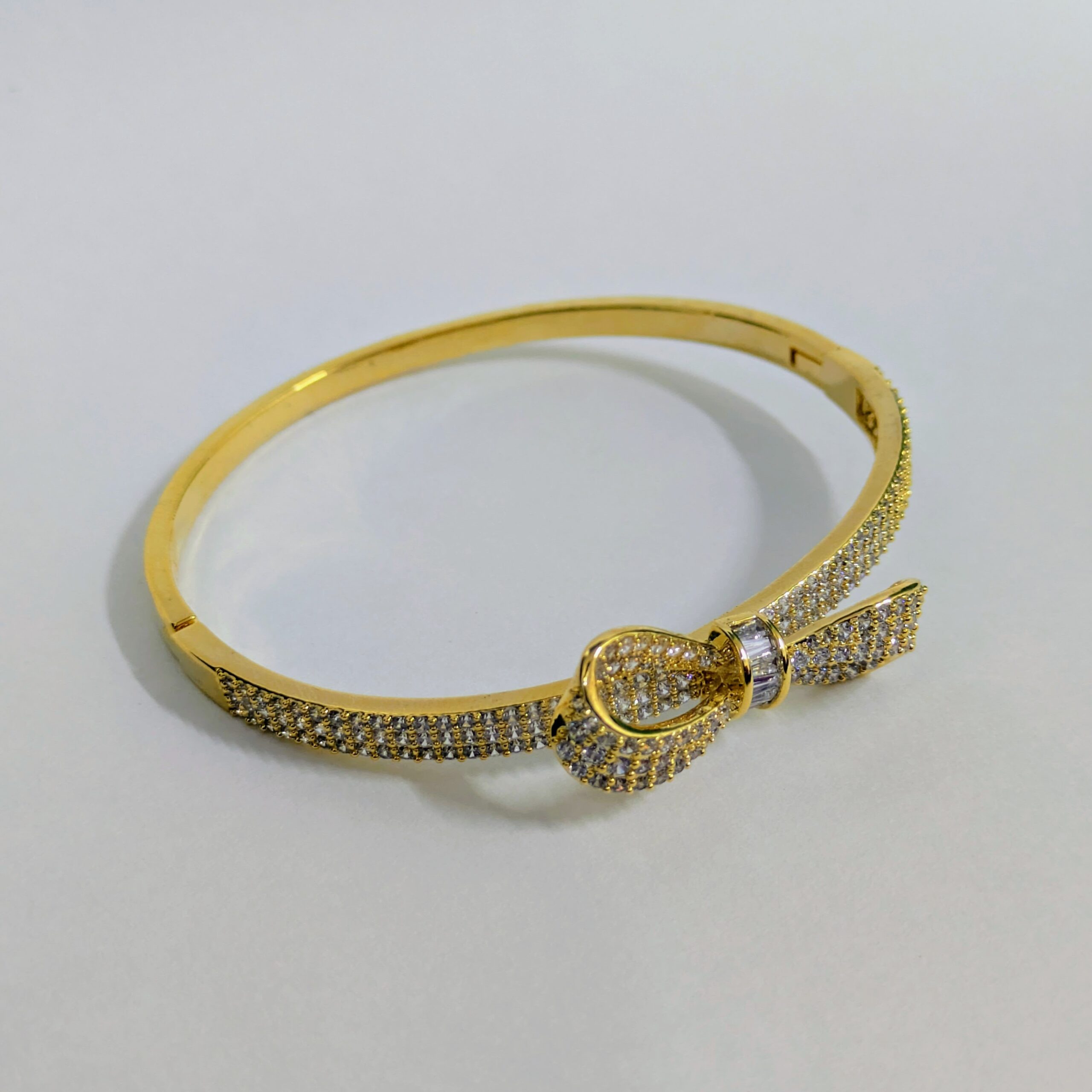 Graceful and charming, the “Bow” Gold-Tone bracelet is designed to add sparkle and elegance to your look. Featuring a delicate bow centrepiece encrusted with shimmering stones, this bracelet captures femininity and sophistication. Its slim design makes it perfect for stacking or wearing solo, ideal for both daily wear and special occasions.