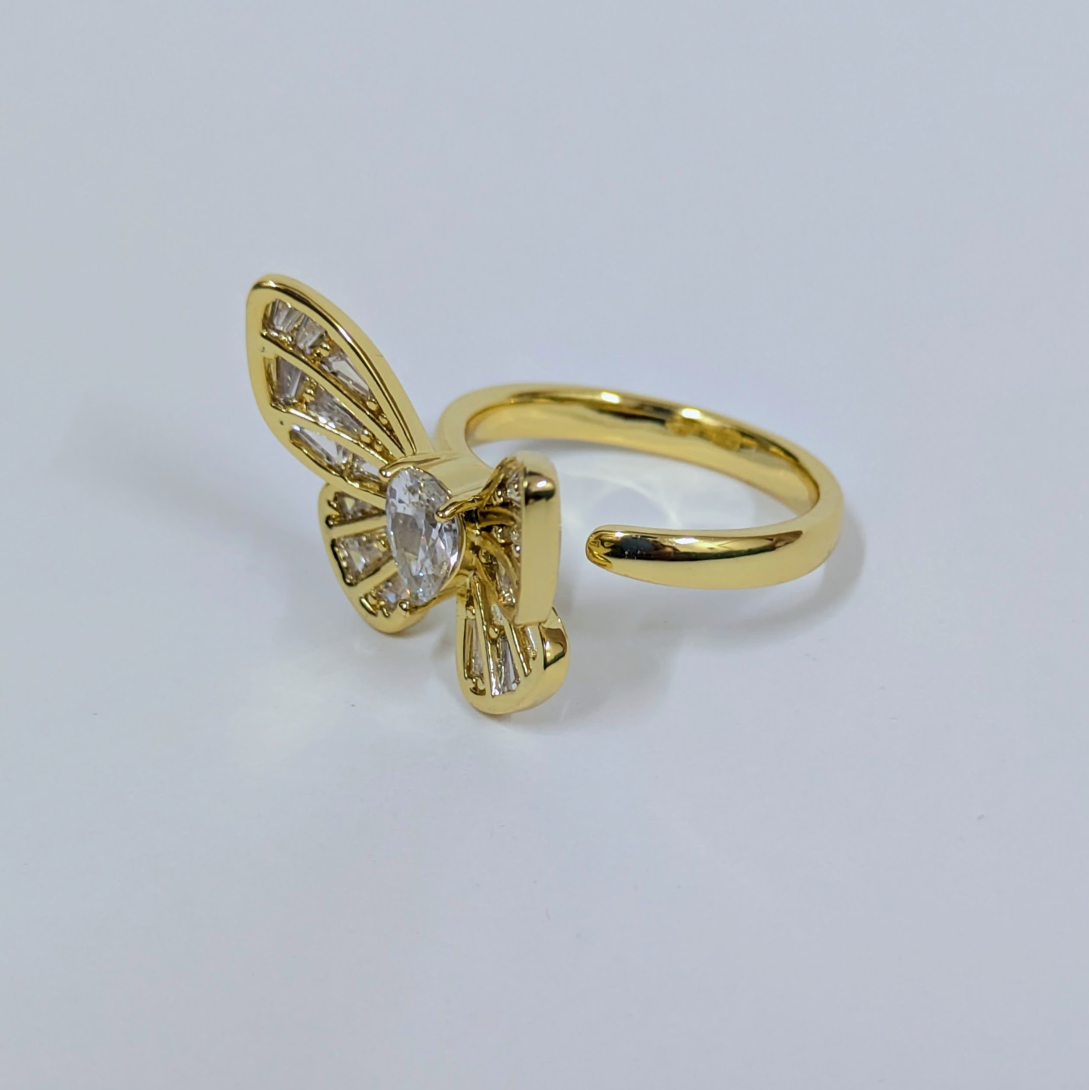 Elevate your style with the regal charm of the **Monarch** ring. This exquisite butterfly ring features a dazzling centerpiece pear-shaped cubic zirconia, flanked by intricate wings set with a mix of brilliant baguette-cut and round-cut stones. Finished with a radiant gold plating, its open-cuff design offers a comfortable and adjustable fit. This ring is a sophisticated and sparkling statement piece, perfect for adding a touch of glamour to any ensemble, from casual to formal.