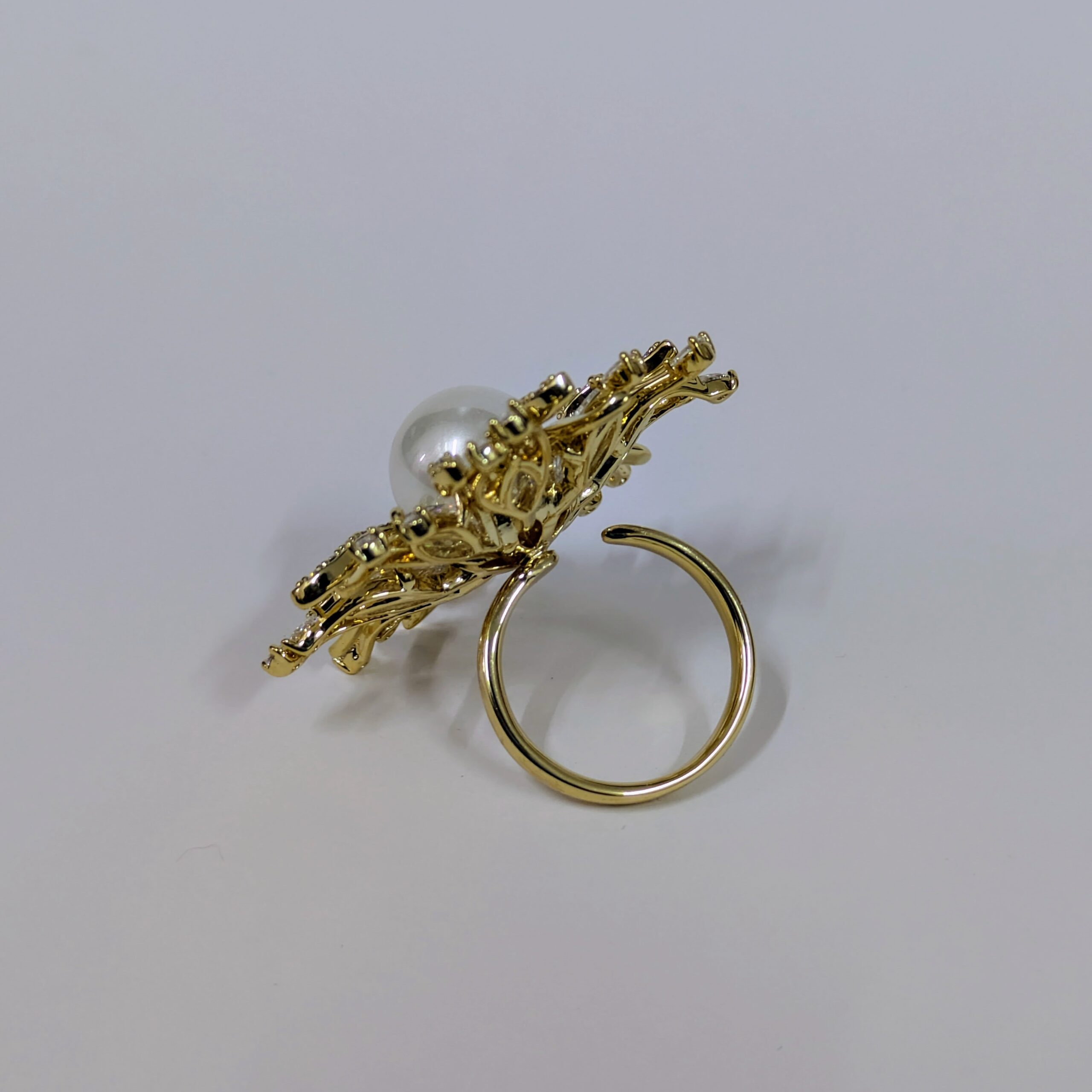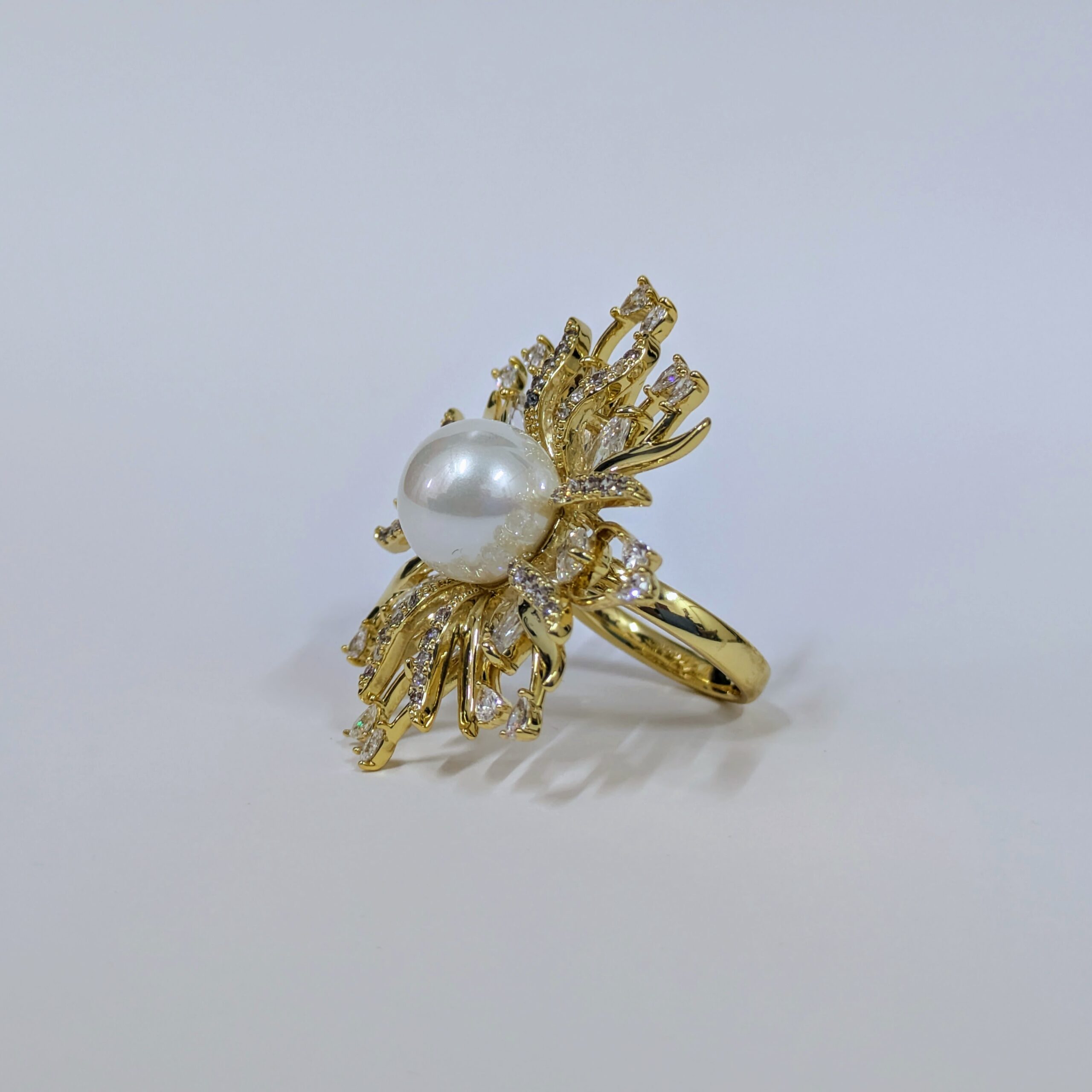 Shine bright with this beautifully crafted imitation fashion ring featuring a radiant sunburst design. At the center is a lustrous faux imitation  pearl, surrounded by sparkling cubic zirconia-style stones on a gold-tone base. Designed for elegance without the high price of precious metals or gems, this adjustable ring is perfect for weddings, festive occasions, parties, or everyday glam.